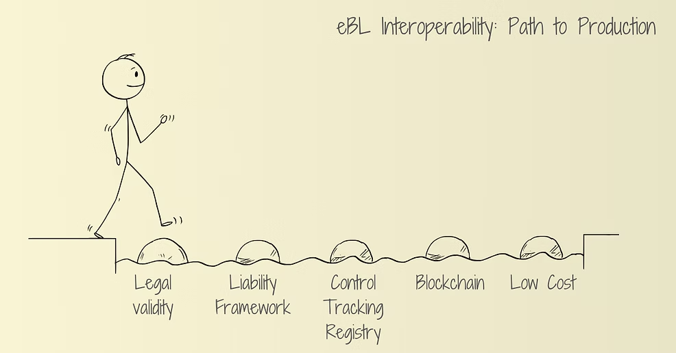 In our eBL interoperability pilot, we’ve chosen an alternative approach – leveraging local law. With jurisdictions like the United Kingdom and France introducing legislation that recognizes electronic trade documents as equivalent to paper, we can use local legislation as the “common language” that transcends different rulebooks. This approach eliminates the need to reconcile diverse legal principles across solutions. Instead, eBL providers simply need to provide an interoperability addendum based on local law, ensuring their framework meets local requirements for maintaining legal equivalence with paper documents.